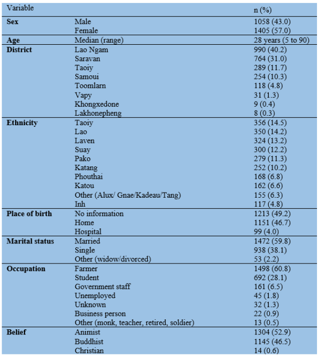 Only two of the selected participants refused to participate due to fear of needles and blood and fear of stigmatization depending on the blood test result. Therefore, a total of 2463 participants were enrolled. The median age was 28 years (range 5 to 90) and 57.0% were females. 40.2% of participants were from Lao Ngam district and 31.0%, 11.7% and 10.3% were from Saravan, Taoiy and Samoui districts, respectively. Less than 10% of the participants were recruited from the remaining districts. 59.8% of participants were married and the main occupation was farming (60.8%). There were 10 ethnic minority groups represented in the study with 52.9% following animism, and 46.5% Buddhism. Almost half of the participants did not know their place of birth, however, 46.7% stated that they had been born at home (Table 1). One serum sample had only enough volume to test for HBV markers, and therefore all other markers had a denominator of n=2462.