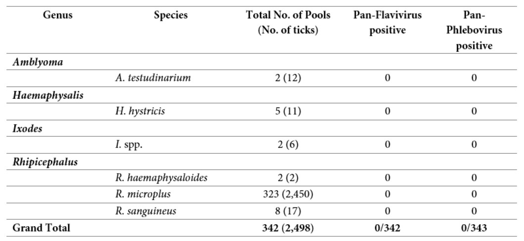 A total of 342 pools (2,498 tick samples) were screened for Pan-Phlebovirus and Pan-Flavivirus by conventional nested RT-PCR. None of them were positive (Table 3).